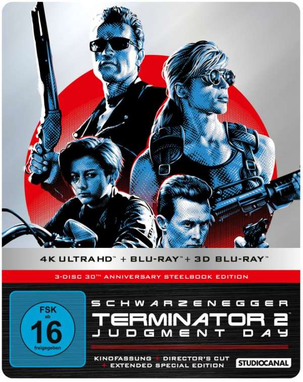 Die Limited Steelbook Edition enthรคlt „Terminator 2“ ebenfalls in der Kinofassung auf 4K UHD Blu-ray (ca. 137 Minuten) sowie einer Blu-ray mit Kinofassung, dem Directorโ€™s Cut (ca. 154 Minuten) und der Extended Special Edition (ca. 156 Minuten), sowie einer 3D Blu-ray der Kinofassung. Auf sonstige Zugaben wir hier verzichtet.